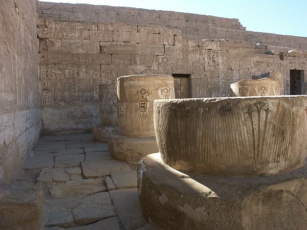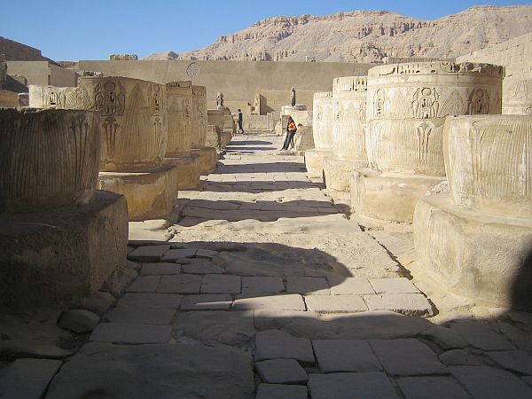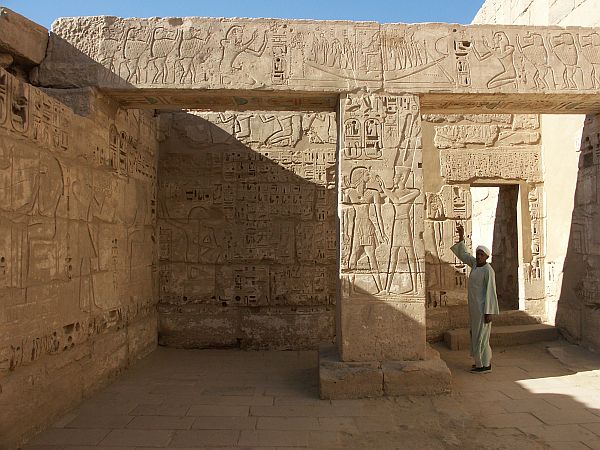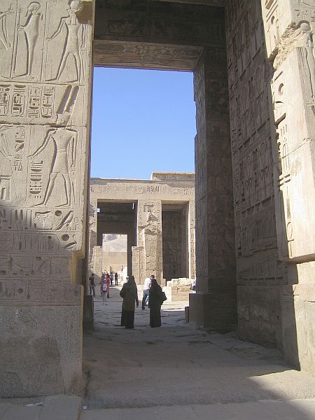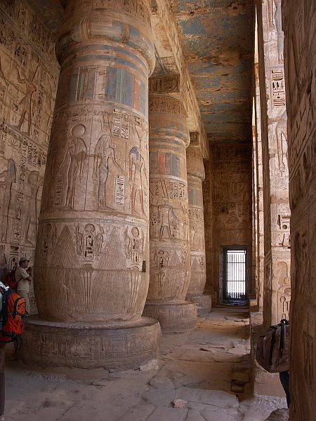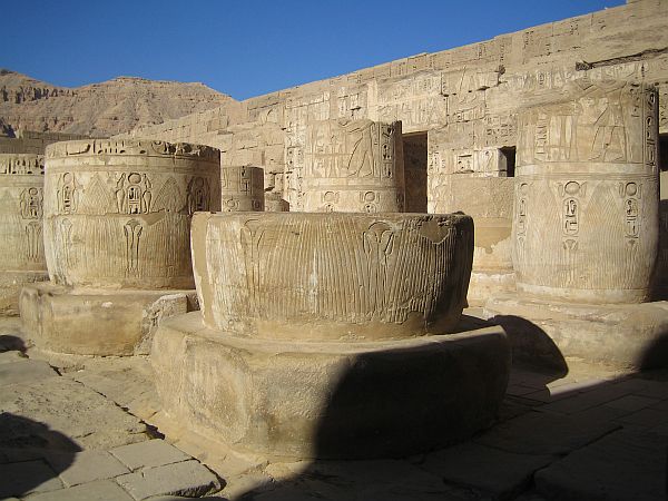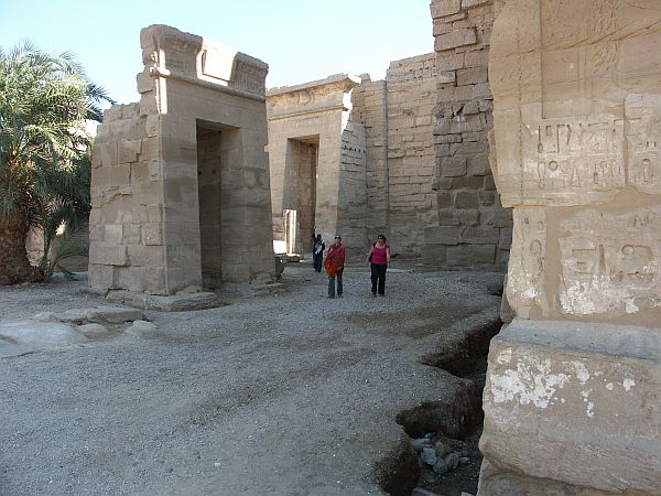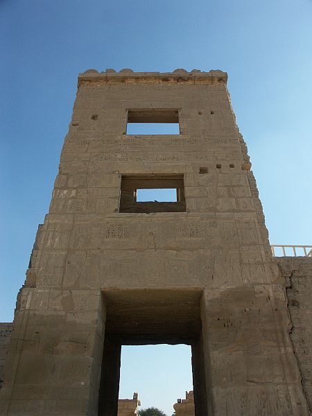Medînet Hâbu ist eine Tempelanlage, die von Pharao Ramses III. errichtet wurde. Hier sehen Sie den hinteren Bereich des Tempels: den zweiten Pylon, den zweiten Hof und die Säulenhalle.